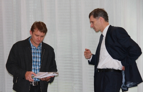 Martin Doktor a Ing. Jiří Kejval se připravují na tiskovou konferenci.