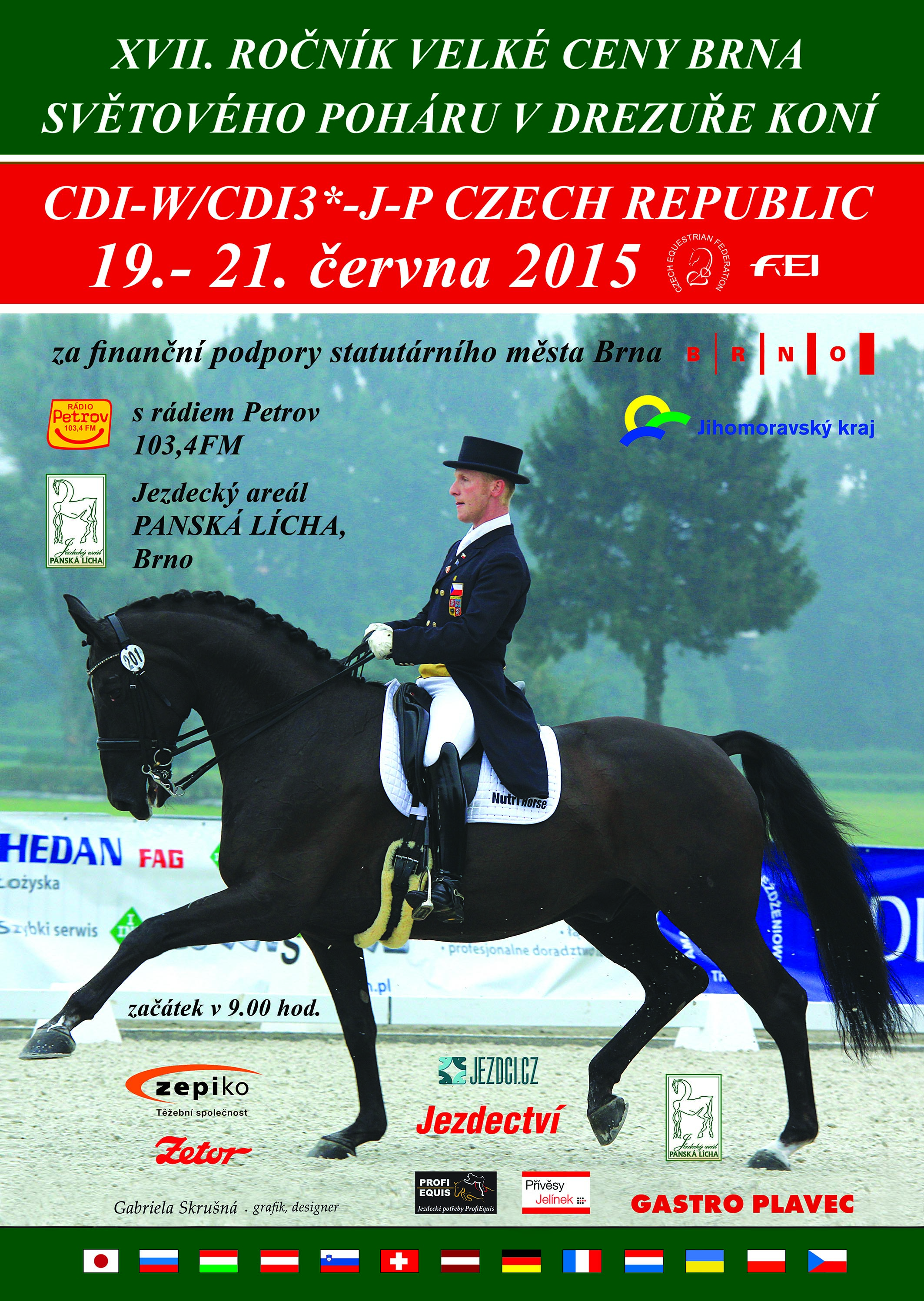 Aktualizace 18. 6. 20:50 HOD: Dnes proběhla veterinární přejímka koní a slavnostní zahájení. Na startu je 84 koní ze 16 zemí, čestným ředitelem je primátor Brna Petr Vokřál. Hlvní rozhodčí je Victoria Mandl z Rakouska, další rozhodčí dorazili z Holandska, Slovenska, Francie nebo Ruska. Poníků startuje 17 (za ČR Sára Vingrálková se dvěma). V malé rundě je 16 účastníků (H. Vášáryová, M. Denš, T. Hábová, A. Neumannová), v GP 10 (E. Jančářová, A. Zeusová).