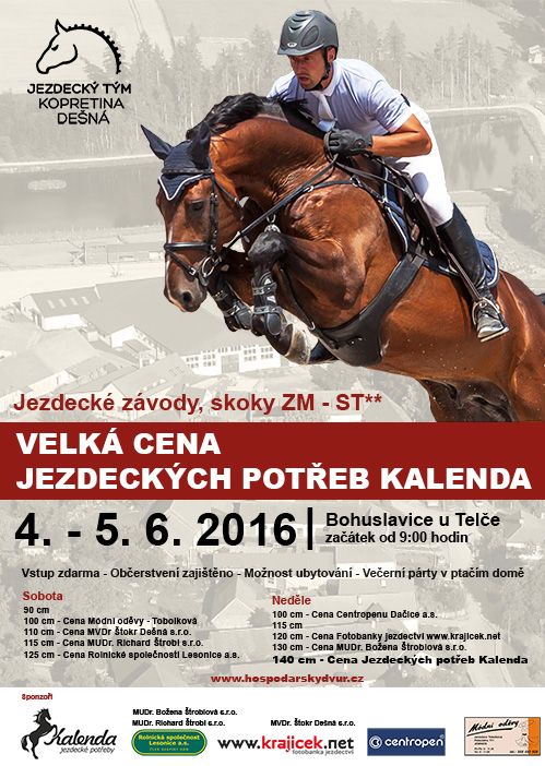 Po roční odmlce se vrací do areálu Hospodářského dvora v Bohuslavicích u Telče jezdecké závody. Jezdecký tým Kopretina Dešná zde uspořádá ve dnech 4. a 5. června skokové závody – Cena Jezdeckých potřeb Kalenda. Na programu závodního víkendu je celkem 10 soutěží od výšky překážek 90 cm do 140 cm. Více uvnitř.
