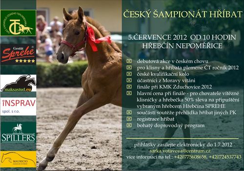 Ve čtvrtek 5. července od 10 hodin se v Hřebčíně Nepoměřice chystá české kvalifikační kolo Českého šampionátu hříbat určené pro klisny a hříbata plemene ČT ročníku 2012. Finále soutěže proběhne při příležitosti finále KMK ve Zduchovicích a hlavní cenou pro chovatele vítězné klisničky a hřebečka bude 50 % sleva na připuštění vybraným hřebcem Hřebčína Sprehe.