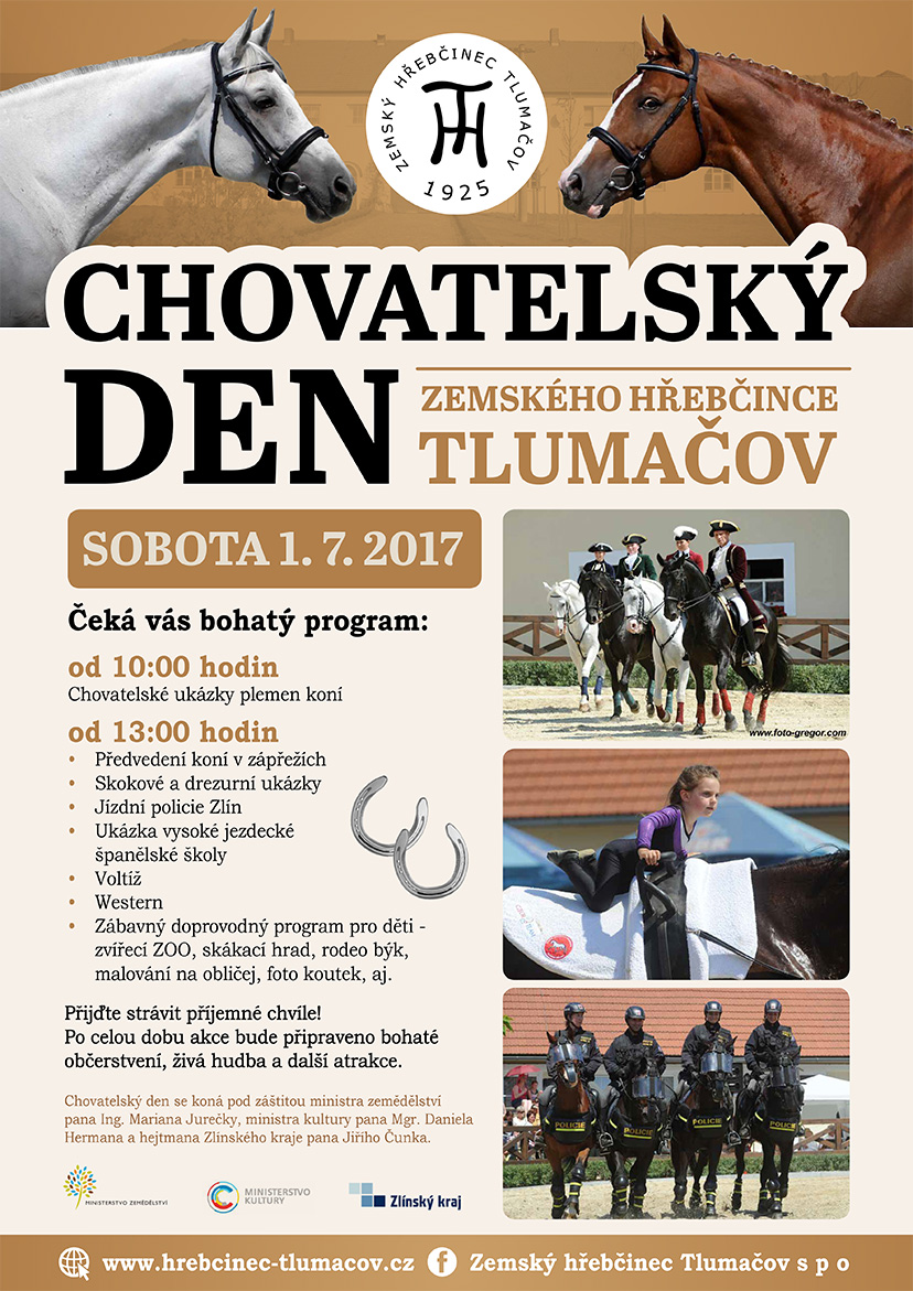 V sobotu 1. července se uskuteční v Zemském hřebčinci Tlumačov tradiční chovatelský den. Na diváky čeká bohatý program. Od 10 hodin den odstartují chovatelské ukázky plemen koní, po kterých bude následovat předvedení koní v zápřeži, skokové a drezurní ukázky, jízdní policie Zlín, ukázky vysoké jezdecké španělské školy, voltiž, western. Pro děti je připraven zábavný doprovodný program – zvířecí ZOO, skákací hrad, rodeo býk, malování na obličej, foto koutek aj.