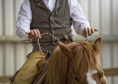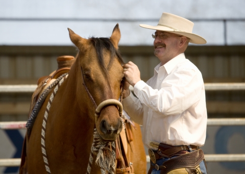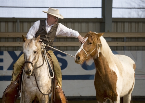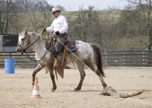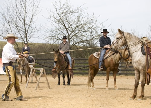 Jeff demonstruje, jak při reálné práci musí kůň umět držet krávu naprosto sám (autor fotky: Tereza Huclová)