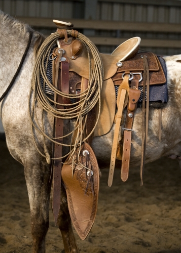 Sedlo Wade Vaquero s tapaderos a 60 stopou Reatou – lasem pleteným z rawhidu (autor fotky: Tereza Huclová)