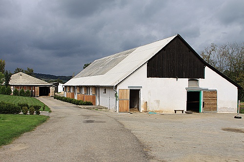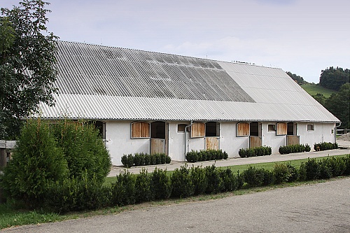 Pohled na pičínský dvůr, vpravo vchod do stájí pro hříbata (volné ustájení).