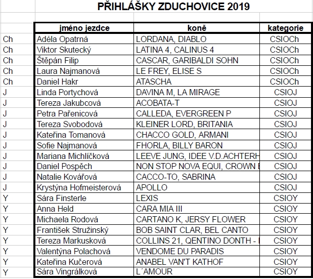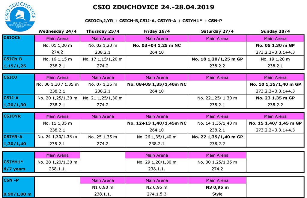 V termínu od 24. do 28. dubna proběhnou v areálu ve Zduchovicích opět mezinárodní závody CSIO (CSIO-Ch,J,YR), CSICh-B, CSIJ-A, CSIYR-A, CSIYH1* a CSN-P.