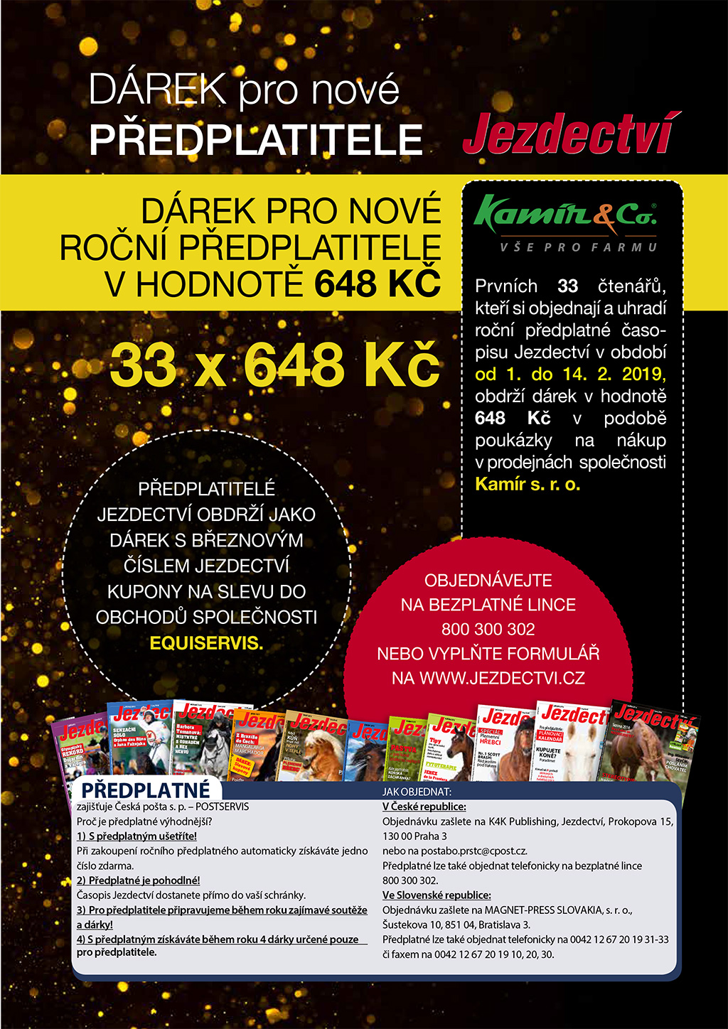 Pro nové předplatitele jsme připravili dárek! Prvních 33 čtenářů, kteří si objednají a uhradí roční předplatné časopisu Jezdectví v období od 1. do 14. 2. 2019, obdrží dárek v hodnotě 648 Kč v podobě poukázky na nákup v prodejnách společnosti Kamír s.r.o.