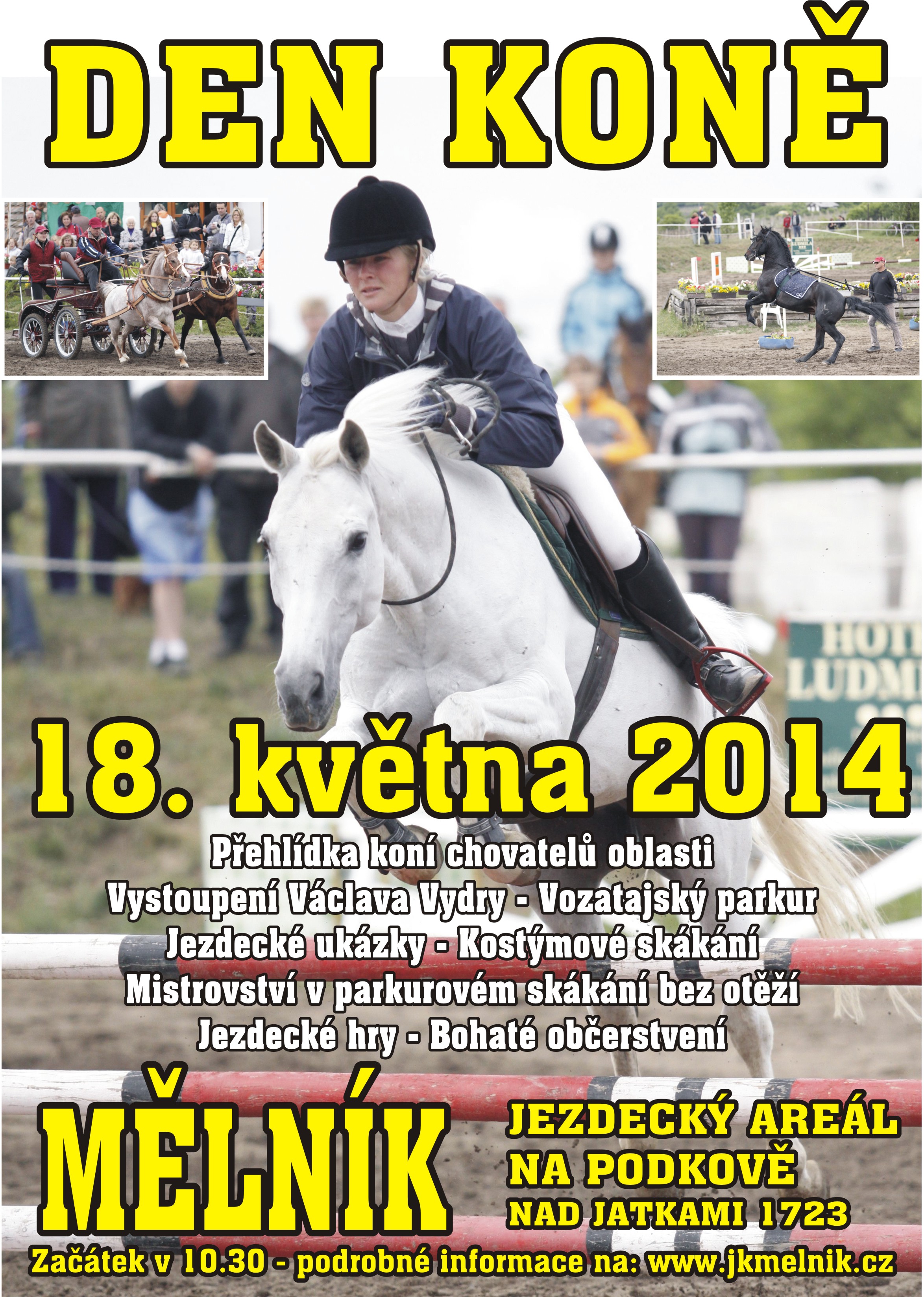 Den koně – přehlídka koní chovatelů oblasti, vystoupení Václava Vydry, vozatajský parkur, jezdecké ukázky, kostýmové skákání, Mistrovství v parkurovém skákání bez otěží, jezdecké hry