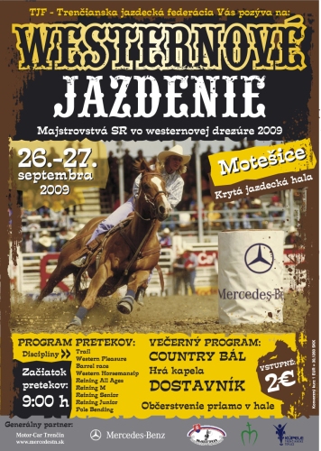 Do slovenského hřebčína Motešice vyrazí o víkendu několik českých westernových jezdců, aby se v místní kryté hale účastnili mezinárodního mistrovství Slovenska ve westernové drezuře. Pakliže se této akce povede, budou Motešice nominovány na pořadatele Středoevropského poháru 2011. Připraven je bohatý program, jak se dozvíte z plakátu. Příští týden přineseme také z této akce malou reportáž.