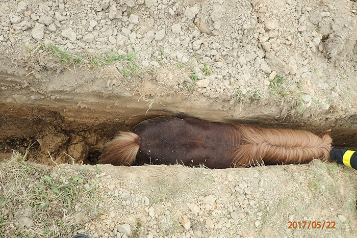 Zvědavý poník předtím slezl do širší části výkopu pro vodovodní přípojku a pomalu dokráčel až do zúženého místa. Dešťová voda zde byla jen na dně. Otočit nešlo, couvat jej nenapadlo. Až přivolaným hasičům se jej podařilo pomocí jemného táhnutí za ohon a opatrného tlačení prázdnou hasičskou hadicí B „nacouvat“ zpět do rozšířené části výkopu, kde se otočil a poté bez jakýchkoli následků odběhl na další chutnou pastvu.