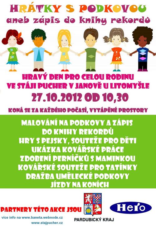 Hravý den pro celou rodinu se uskuteční 27. 10. od 10:30 hodin ve Stáji Pucher v Janově u Litomyšle a konat se bude za každého počasí, jelikož jsou k dispozici vytápěné prostory. Čeká vás malování na podkovy a zápis do knihy rekordů, hry s pejsky, soutěže pro děti, ukázka kovářské práce, zdobení perníčků s maminkou, kovářské soutěže pro tatínky, dražba umělecké podkovy a jízdy na koních.