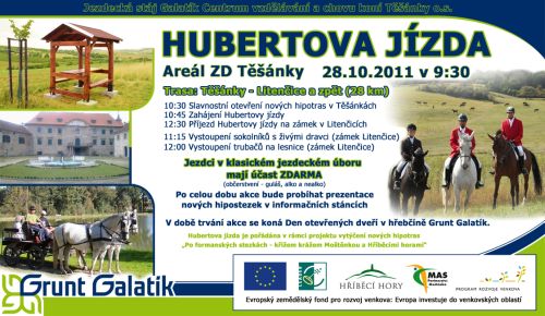 V Hříběcích horách vás na Hubertovské slavnostní otevření hipostezek zveme dne 28. 10. do JS Galatík Těšánky, kdy bude zpřístupněno 150 km hipotras v této oblasti. Tak se ve Zlínském kraji jezdci na koních mohou pohybovat po 233 km hipotras a další trasy jsou již v plánu na Bystřicku.