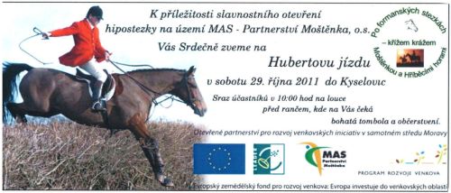 Otevření nových tras je spojeno s tradičními podzimními Hubertovými jízdami. Koňaři z oblasti Moštěnka byli první, kteří se mohli v rámci Hubertových jízd projet po části z 76 km nových hipotras při slavnostní otvírání, to již proběhlo 8. 10. v Bochoři a 15. 10. v Radkově Lhotě. Na poslední otevření části této hipostezky se můžete přijet podívat 29. 10. na Huberta do  Kyselovic, viz pozvánka.
