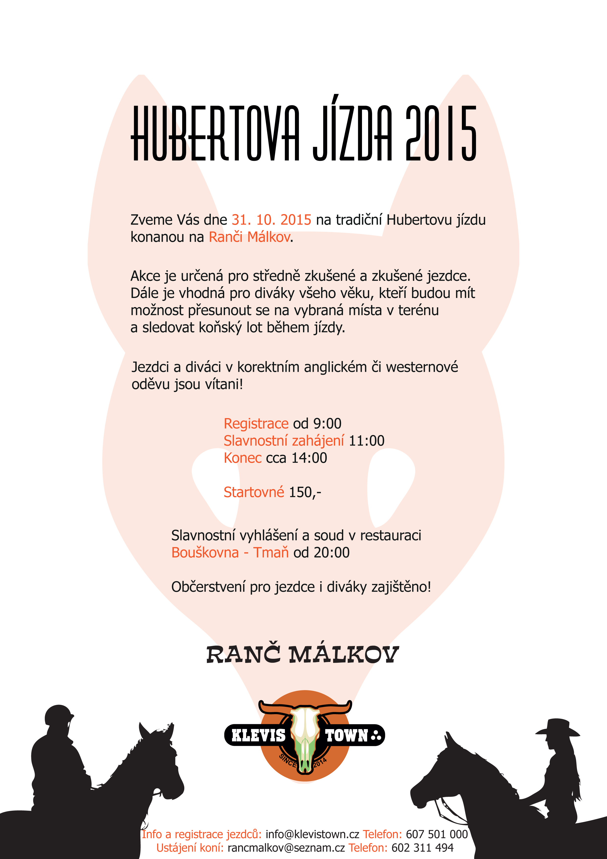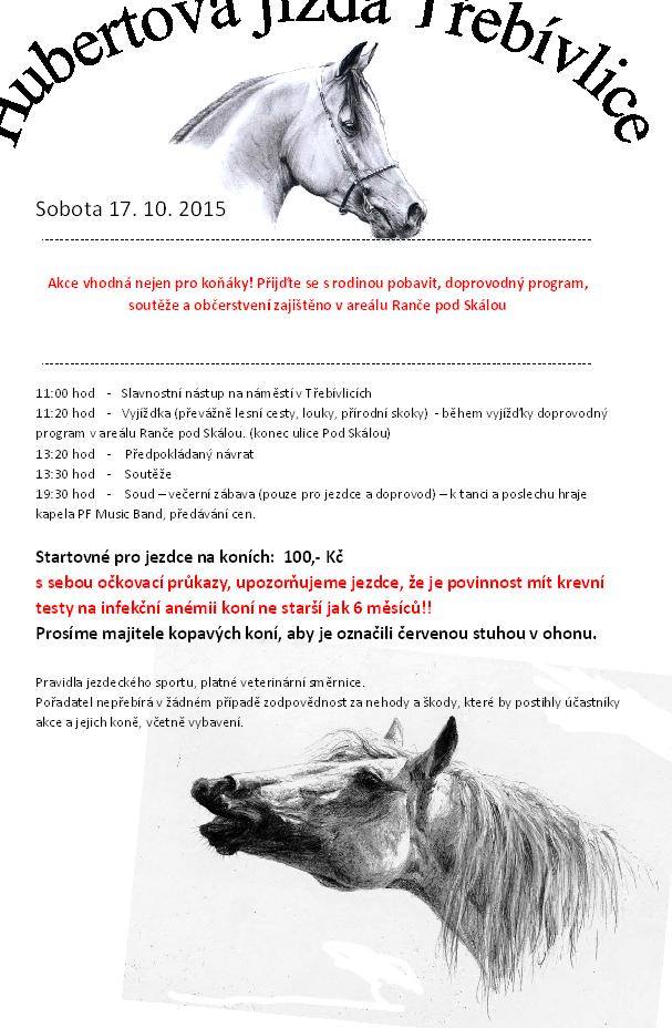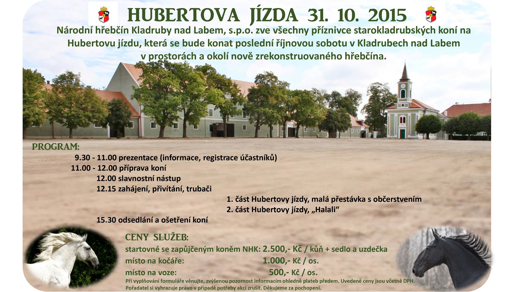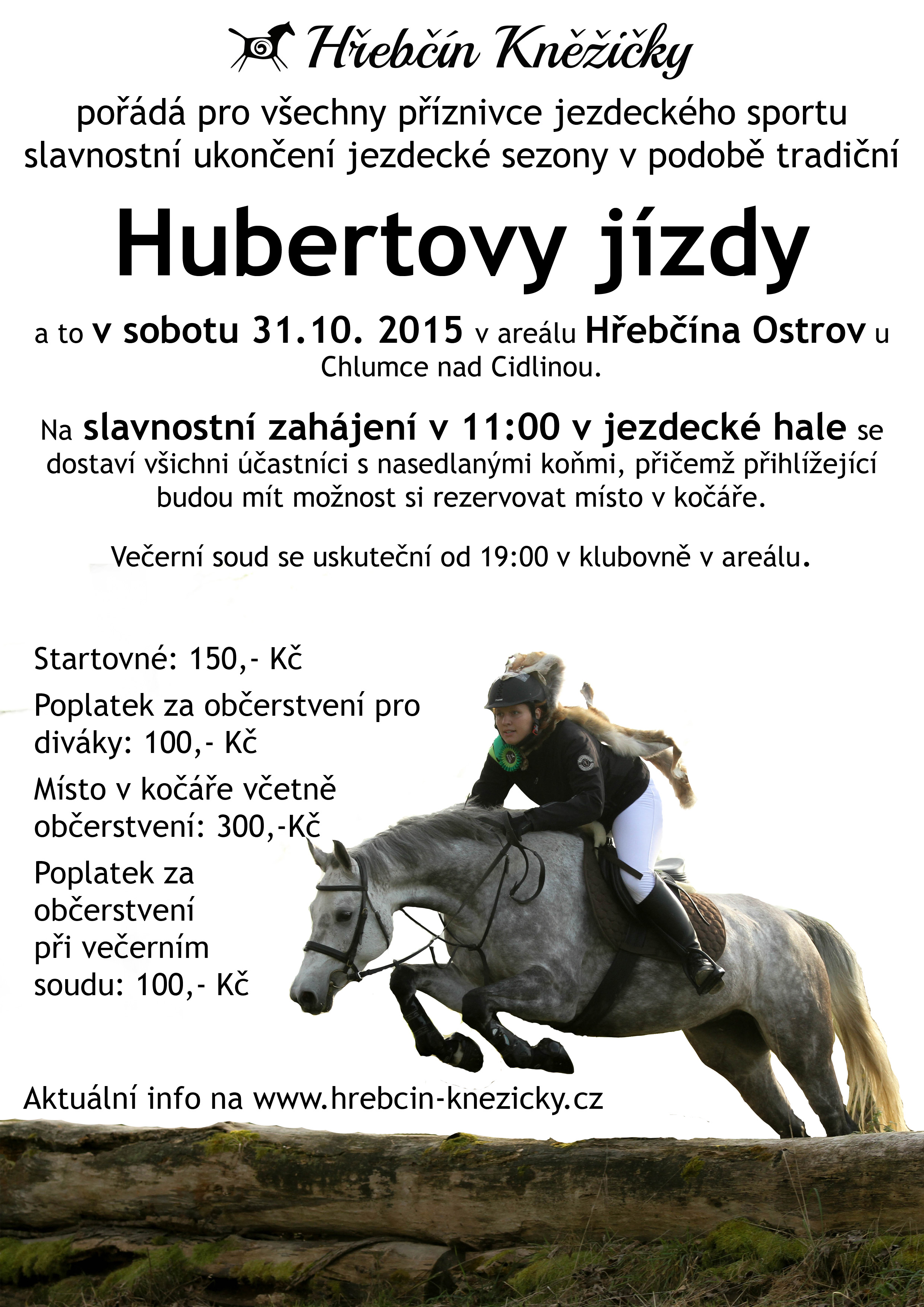 Startovné je 150 Kč, v ceně je ranní pohoštění, oběd a večeře. Prosíme všechny jezdce aby se slavnostně oblékli. Povinné jsou bílé kalhoty, jez. sako, bezpečnostní helma a jezdecké boty. Dámy mohou jet v dámském jezdeckém kostýmu. Před vyložením koní budeme kontrolovat zdravotní průkaz koně. Srdečně se na Vás těší TJ Horšov