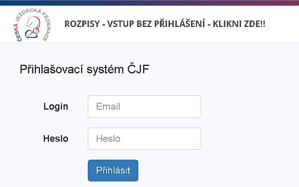 • Jezdec přihlašující se na závody – pokud jezdec má v systému svoji aktuální e-mailovou adresu (evidovanou ze strany oblastního sekretáře v Centrále nebo ze strany mateřského subjektu v Přihlašovacím systému), pak při prvním pokusu o přihlášení do přihlašovací aplikace touto evidovanou adresou (bez zadání hesla) mu portál zašle na tento email automaticky vygenerované prvotní heslo. To si po prvním autorizovaném přihlášení může libovolně změnit. Jezdci je automaticky nastavena příslušná role – tj. může přihlašovat na závody pouze sám sebe a požadované koně.