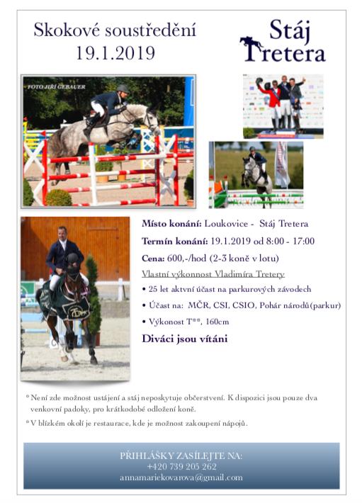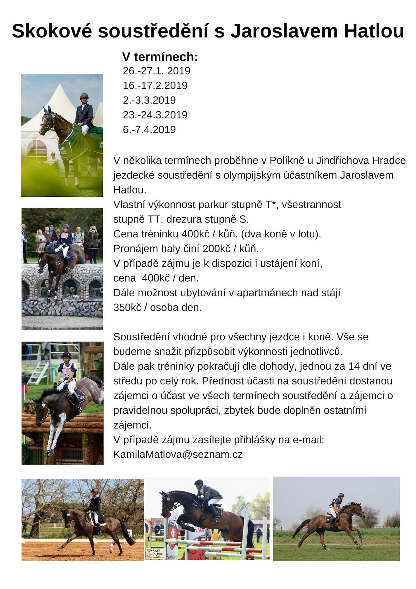 Obořiště. Skokové soustředění pro všechny kategorie jezdců a koní, cena za dva dny je 1000,- kč ( trénink + hala), cena ustajení na dva dny 1800,- kč. Přihlášky zasílejte nejpozději do 16.1.2019 na e-mail : milavitek@seznam.cz. Facebook
