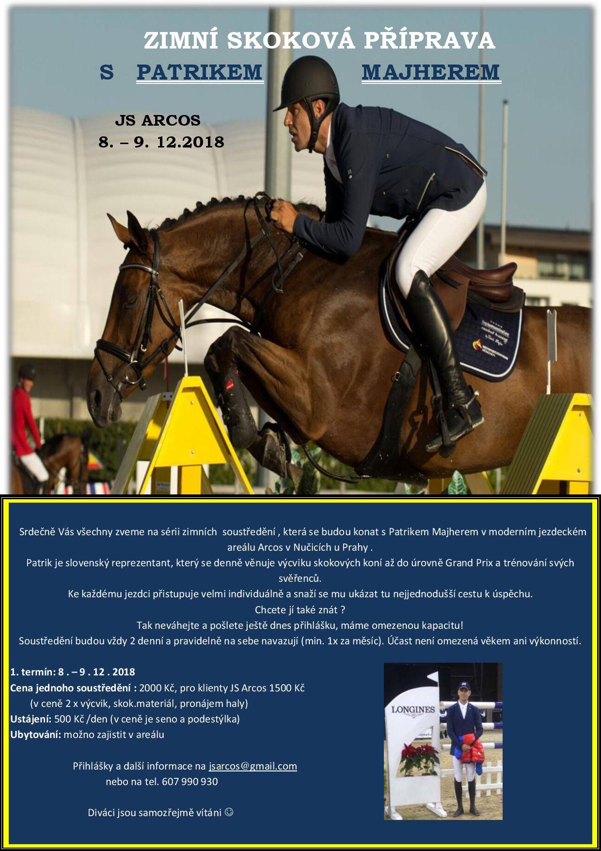 Stáj Karsit si vás dovoluje pozvat na skokové soustředění s Terezou Mückovou, které se bude konat 8.-9.12.2018 ve stáji Karsit ve Velichovkách. Práce bude přizpůsobena výkonnostní úrovni jezdců. Po dohodě možné i zapůjčení koně. Tréninková plocha dle počasí (hala 22x45m, či venkovní jízdárna 30x70m) Cena soustředění 800,-/den, 1500,-/oba dny. V ceně je zahrnut trénink + box pro koně. Omezený počet účastníků Ubytování možné rezervovat v hotelu K-triumf v areálu stáje. www.k-triumf.cz Přihlášky prosím zasílejte na e-mail: muckova.t@seznam.cz kontaktní osoba: Tereza Mücková: 720 530 463