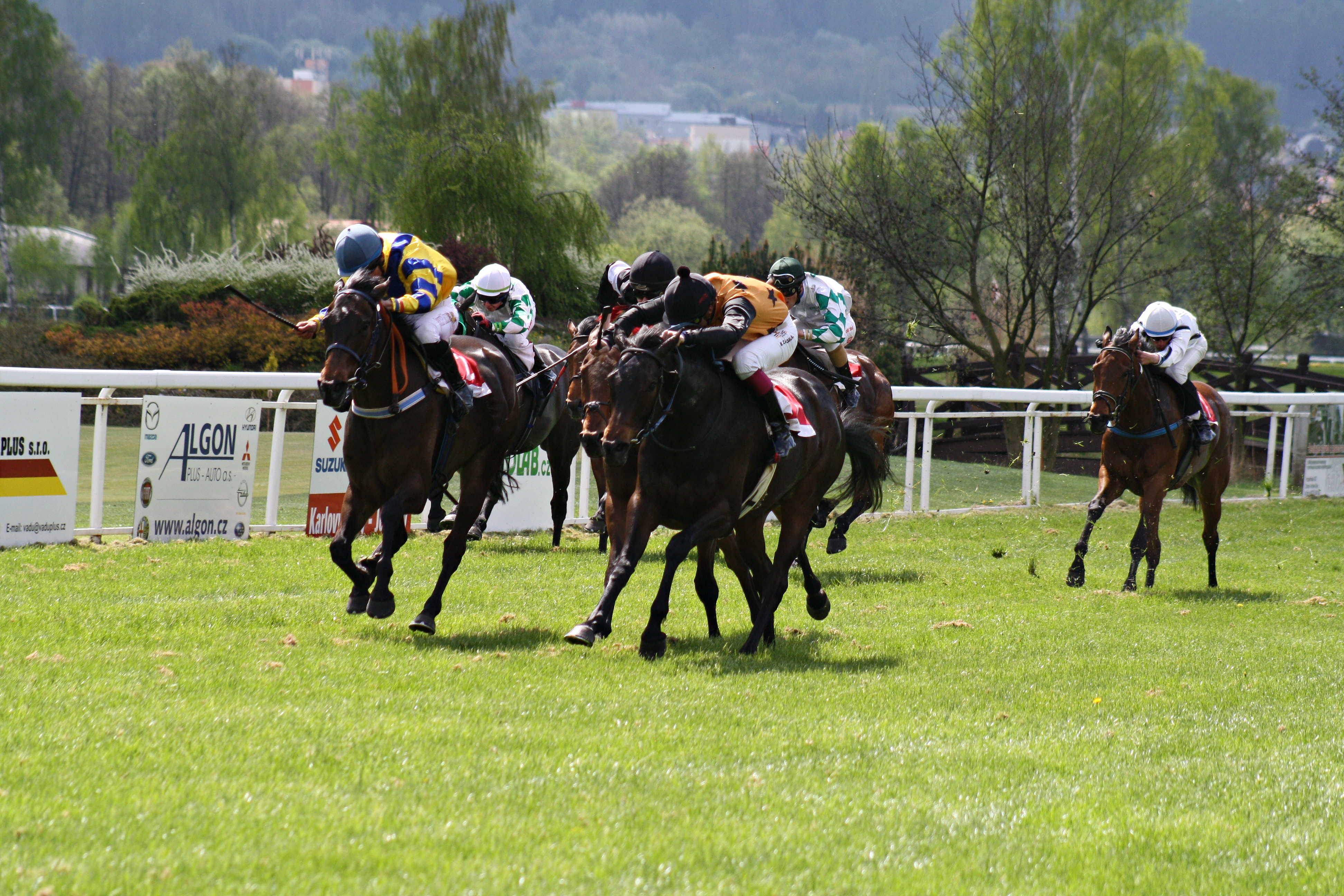 Hlavním dostihem sedmidílného programu bude Jarní cena (Frühjahrspreis) Fredericks & von der Horst (II.kat., 2.000m) pro čtyřleté a starší koně. Jedním z nejvážnějších adeptů na vítězství bude pětiletý hřebec Brutal Rocco (ž.J.Rája). Své kvality ukázal již jako tříletý. V Českém derby doběhl na výborném 4. místě, osmý byl ve Slovenském derby. Zúčastnil se obou vytrvalostních vrcholů sezóny, Českého i Slovenského St. Legeru. V loňském roce zvítězil v jedničkové Ceně města KV. Na téže dráze skončil druhý ve dvoukilometrovém testu II. kategorie. Suverénně si počíná také v aktuální sezóně. První letošní zahřívací start v dostihu III. kategorie lehce vyhrál. Úřadující trenérský šampión Allan Petrlík posílá na start dvojici svěřenců. Potomek vítěze irského Derby a francouzského Vítězného oblouku Dylana Thomase Rabbit Thomas (ž.J.Pavlíček) byl vloni sice neúspěšným účastníkem Slovenského derby, dokázal ale vyhrát dostih III. kategorie a na podzim získal ve dvojkovém testu 2. místo. Dobrý výkon můžeme očekávat od Rabbit Verglase (ž.J.Verner), který v minulém roce triumfoval jak ve třetí, tak ve druhé kategorii. Podobně úspěšným, tedy trojnásobně vítězným účastníkem je Shadow Moon (ž.R.Koplík). Čtyřletá Aurora (ž.J.Chaloupka) předvádí vyrovnané výkony a na přední příčky by měla útočit i nyní. Někdejší účastnice slušovické Ceny zimní královny se postupně dokázala vítězně předvést v dostizích čtvrté, třetí i druhé kategorie. Na místo činu se vracejí dvě milovnice karlovarského travnatého oválu. Vítěznou Mambo Lady (M.Laube) si diváci pamatují z dostihu III. kategorie před dvěma lety. V loni obsadila v dvojkové Letní ceně klisen třetí místo. Old Glory (ž.M.Zatloukal) zde v minulém roce vyhrála dvakrát, dostih třetí a druhé kategorie. Čtyřletá Victory Bond (ž.P.Foret) v minulé sezóně nezahálela. Absolvovala deset startů s dobrými umístěními a s jistotou zakotvila ve dvojkové společnosti. Dotované místo by nemuselo být nad její síly. Navíc má výhodu nejnižší nesené hmotnosti v poli. Před dvěma lety hlavní dostih ovládl Connex trenéra Šatry. Ten letos do boje posílá Tycha Brahe (ž.J.Šafář), který si v nejvyšší společnosti hledá své místo. Do této chvíle se dokázal vítězně prosadit v kategorii o stupínek nižší.