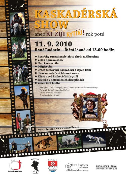 V krásném prostředí Říčních lázní v Praze Radotíně proběhně 11. 9. kaskadérská show na koních, a jelikož se kaskadérská skupina Caballos podílela na nateční filmu Ať žijí rytíři, bude scénář této akce s filmem propojen! Těšit se můžete na rytířský turnaj, práci kaskadérů a jejich koní, džigitovku, královskou drezurní ukázku, ohňovou show na koních a ve finále se budete moci sami přesvědčit, jak se natáčela jedna zajímavá scéna ve filmu.