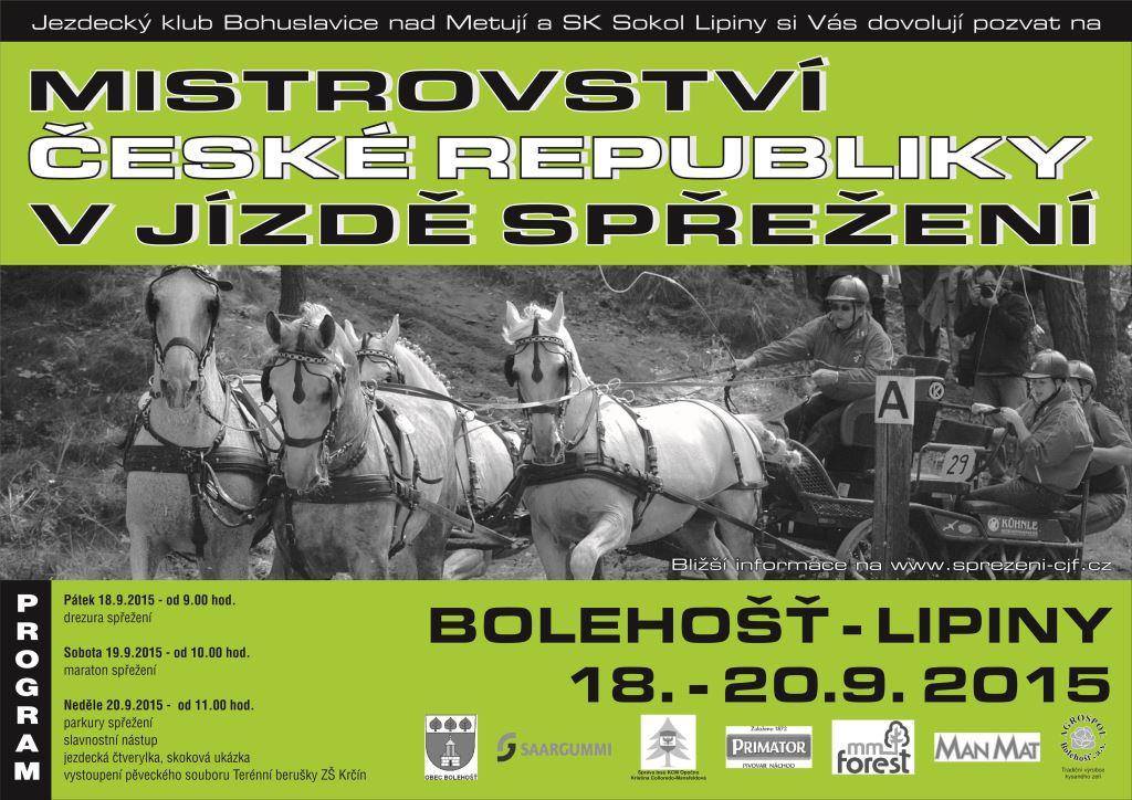 Ve dnech 18. – 20. září se v Bolehošti-Lipinách koná Mistrovství České republiky v jízdě spřežení. Přihlášeno je rekordních 44 spřežení. V pátek je na programu drezura spřežení, v sobotu maraton a v neděli parkur se slavnostním nástupem. V kalendáři najdete startky. On-line výsledky můžete sledovat zde. Celkové výsledky MČR: Dvojspřeží pony (8) – E. Zuvač, jednospřeží (14) J. Exnar, dvojspřeží (10) L. Jirgala, čtyřky (5) Radek Nesvačil. Více uvnitř článku.