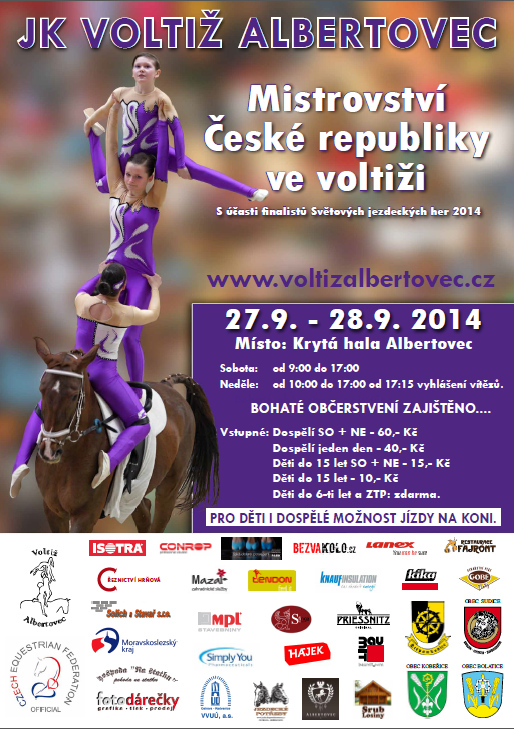 Mistrovství České republiky ve voltiži se bude konat v termínu 26. – 27. září v areálu JK Voltiž Albertovec. V pátek od 14 hodin proběhnou oficiální tréninky, poté veterinární kontrola a technická porada vedoucích ekip. V sobotu začínají soutěže v 9 hodin a v neděli v 10 hodin. Rozpis uvnitř. Aktualizace 25. 9. 19:20 HOD: TZ – Albertovec hostí mistrovství ČR ve voltiži 2014. 29. 9. 14:15 HOD: TZ – Na albertovském mistrovství ČR ve voltiži 2014 uspěli favorité. Půlhodinovou reportáž odvysílá Česká televize v pátek 3. října od 14.50 hodin na kanálu ČT Sport.