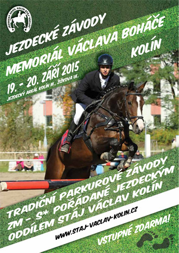 Stáj Václav Kolín pořádá o víkendu 19. – 20. září v Kolíně tradiční parkurové závody – 35. ročník Memoriál Václava Boháče. Na programu jsou soutěže ZM – S*. Zároveň se v neděli koná finále Středočeské jezdecké ligy. Aktualizace 21. 9. 8:50 HOD: Kompletní výsledky. sobota 115 cm – P. Bleha a Emil 1, neděle 120 cm – T. Mücková a Meidlinger’s, 125 cm – P. Bleha a Emil 1