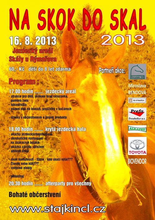 V pátek 16. 8. se v areálu Jezdeckého oddílu Skály u Rýmařova koná charitativní koňská show – výtěžek z ní bude věnován nadaci „Pomozte dětem“. Na místě vás čekají atrakce pro děti, lukostřelba, jezdecká a akrobatická vystoupení, svezení v sedle či kočáře a dokonce i ohňostroj.