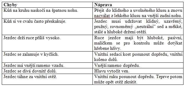 Jezdec v lehkém klusu pobízí oběma holeněmi tak dlouho, až kůň podle vlastního výběru naskočí do pravého nebo levého cvalu. Nejdříve pouze pružně a pohyblivě drží zkrácené otěže po obou stranách krku. Později už ve cvalu pobízí a otěže prodlužuje, až nakonec může cválat i na zahozených otěžích; takt a rovnoměrnost cvalových skoků „udržuje sedem“.