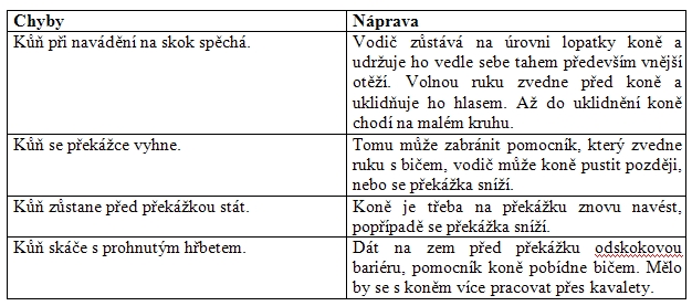 Zpočátku se kůň vodí v kroku přes bariéry ležící do oblouku na zemi, potom na lonži kluše přes kavalety, později také cválá přes překážky až do výšky asi 1,10 m. Kůň se na skok navádí z vnější strany ve volném kroku. Jakmile ukáže chuť skákat, vodič ho vypustí. U překážky by měl stát pomocník s bičem.
