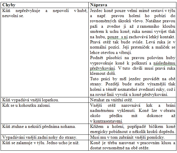 Obrat okolo předku procvičujeme v zastavení pouze tak dlouho, než kůň pochopí jednostranně působící pomůcky – vnitřní holeň a otěž. Poté ho budeme provádět pouze v pohybu. Přitom kůň šlape předkem na malém kroužku, jeho záď okolo něho opisuje excentrický větší kruh.
