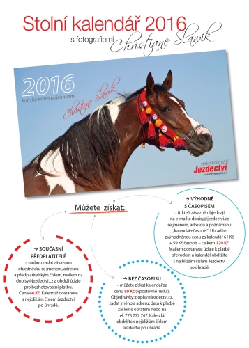 Opět po roce můžete objednávat stolní kalendář na rok 2016 s fotografiemi Christiane Slawik, zvýhodněný nákup pro předplatitele i pro ty, kteří objednají s aktuálním číslem časopisu Jezdectví.