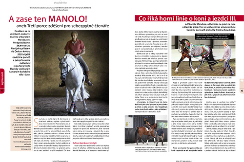 Snad vše, co mohlo být o M. Mendezovi ve stručnosti sděleno, najdete v předchozích dvou číslech Jezdectví. Připomínáme jen, že v minulých dílech svého pojednání Manolo Mendez pracovně rozčlenil „obvod koně“ na horní a spodní linii, a stihl se věnovat hlavě, vazu, hrdlu, krku, plecím, předním nohám a hřbetu… Více v květnovém Jezdectví!