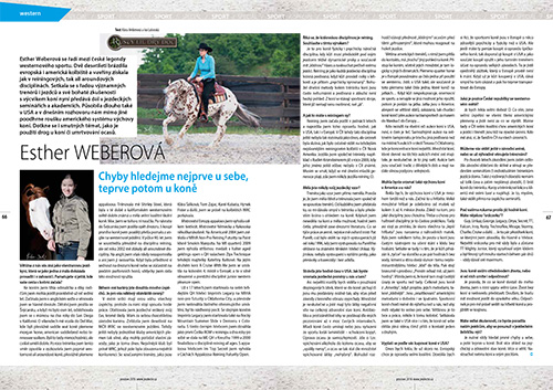 Esther Weberová se řadí mezi české legendy westernového sportu. Dvě desetiletí brázdila evropská i americká kolbiště a vavříny získala jak v reiningových, tak all aroundových disciplínách. Působila dlouho také v USA a v rozhovoru v prosincovém čísle časopisu Jezdectví nám mimo jiné poodhrne roušku amerického systému výchovy koní. Dotkne se i smutných témat, jako je použití drog u koní či umrtvování ocasů…