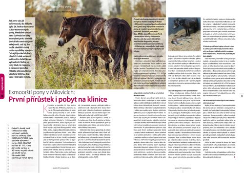 Stádo exmoorských pony v Milovicích má za sebou první přírůstek i pobyt na klinice. V prosincovém čísle časopisu Jezdectví najdete exkluzivní rozhovor s MVDr. Janou Mezerovou z Veterinární kliniky Heřmanův Městec o tom, jak probíhaly vyšetření a léčba celorepublikově sledovaných pacientů. Kdo tento projekt sleduje a má informace pouze z tiskových zpráv, bude jistě překvapen…
