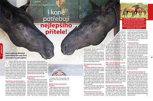 Nové výzkumy dokazují: úzké vztahy činí naše koně šťastnějšími a zdravějšími. Vězte, že i když nám někdy kamarád našeho koně nevyhovuje, protože spolu vymýšlí opravdové blbiny, jejich přátelství bychom podporovat měli. Proč? Protože jde o zdraví a blaho našeho zvířete! Koně totiž mají z takového přátelství mnoho výhod! Těsné vazby koně uklidňují, uzdravují a činí je šťastnějšími. To ukazují výsledky nových výzkumů specialistů na chování koní. A z přátelství mohou profitovat dokonce sami jezdci – minimálně při tréninku. O tom si však povíme později. Více v červencovém Jezdectví!