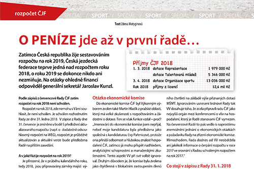 Zatímco Česká republika žije sestavováním rozpočtu na rok 2019, Česká jezdecká federace teprve jedná nad rozpočtem roku 2018, o roku 2019 se dokonce nikdo ani nezmiňuje. Na otázky ohledně financí odpověděl generální sekretář Jaroslav Kunzl… Více v říjnovém Jezdectví.