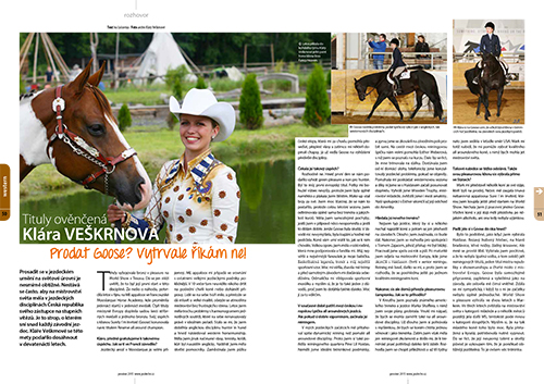 Prosadit se v jezdeckém umění na světové úrovni je nesmírně obtížné. Nestává se často, aby na mistrovství světa měla v jezdeckých disciplínách Česká republika svého zástupce na stupních vítězů. Je to strop, o kterém sní snad každý závodní jezdec. Kláře Veškrnové se této mety podařilo dosáhnout v devatenácti letech… Více v prosincovém čísle časopisu Jezdectví!