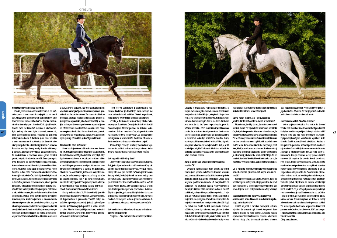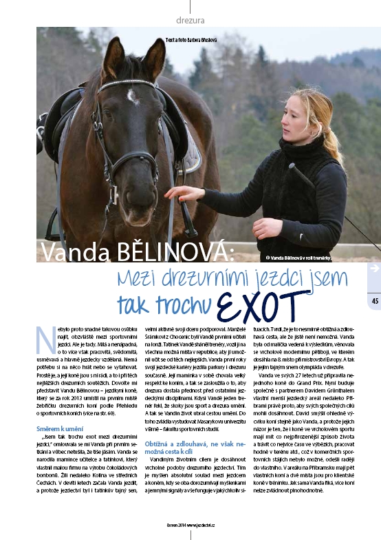 Nebylo proto snadné takovou osůbku najít, obzvláště mezi sportovními jezdci. Ale je tady. Milá a nenápadná, o to více však pracovitá, svědomitá, usměvavá a hlavně jezdecky vzdělaná. Nemá potřebu si na něco hrát nebo se vytahovat. Prostě je, a její koně jsou s ní rádi, a to i při těch nejtěžších drezurních soutěžích. Dovolte mi představit Vandu Bělinovou – jezdkyni koně, který se za rok 2013 umístil na prvním místě žebříčku drezurních koní podle Přehledu o sportovních koních. Mezi její trenéry patřil i MVDr. Norbert Záliš, jemuž gratulujeme ke dnešním jmeninám!