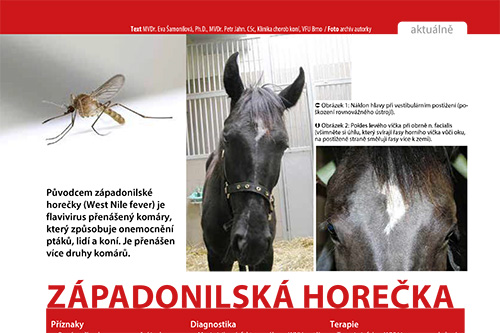 Původcem západonilské horečky (West Nile fever) je flavivirus přenášený komáry, který způsobuje onemocnění ptáků, lidí a koní. Je přenášen více druhy komárů. Více v říjnovém Jezdectví.