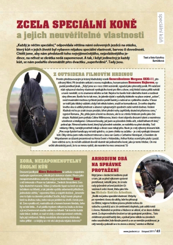 „Každý je něčím speciální,“ odpovídala většina námi oslovených jezdců na otázku, který kůň v jejich životě byl vybaven nějakou speciální vlastností, barvou či dovedností. Chtěli jsme, aby nám představili toho nejvýjimečnějšího, nejzvláštnějšího jedince, na něhož se zkrátka nedá zapomenout. A tak, i když jedinečný je každý kůň, se nám podařilo shromáždit přes dvacítku ´superhrdinů´. O neuvěřitelných vlastnostech těchto koní se dočtete v listopadovém Jezdectví.