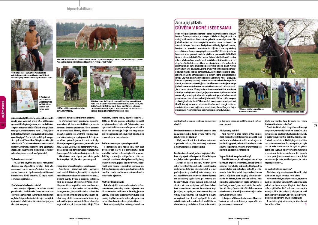 Občanské sdružení pro hiporehabilitaci Bydžovská Lhotka již deset let vede Miroslava Bártová. Bývalá zootechnička nenávidí dříve tak běžné věci, jako klecový odchov nebo vazné ustájení. Spolu se čtyřnohým i dvounohým osazenstvem pomáhá seniorům, postiženým lidem i dětem s psychickými a fyzickými problémy.