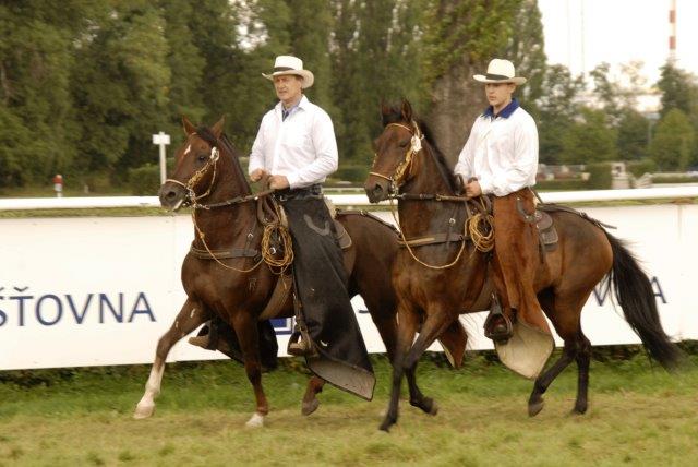 Jako prvního jsem dovezl tehdy 5letého neobsednutého hřebce Bonachon (v rodokmenu 2x Resorte III., také Resorte IV. do té doby nejlepší plemeník, La Chunga – 10 let neporažená klisna, a další..). Jeho zbarvení se nazývá alazán tostado, což se dá přeložit jako připálený ryzák, tmavě měděný ryzák, velmi ceněné v zemi původu: kolumbijské přísloví říká, že alazán tostado je dříve mrtvý, než unavený. A opravdu jeho energie je nevyčerpatelná i dnes, když mu bude už 21 let. Byl to můj první kůň, které ho jsem obsedal a přiježďoval. Postupoval jsem přitom podle zásad kolumbijského jezdectví, které jsem se tam 8 let učil, to znamená nejprve na jejich bosale – a po 3 měsících výcviku na něm jezdil můj tehdy 10letý syn bez sedla. Poprvé jsme Bonachona předvedli v r. 2001 na výstavě v Lysé nad Labem.