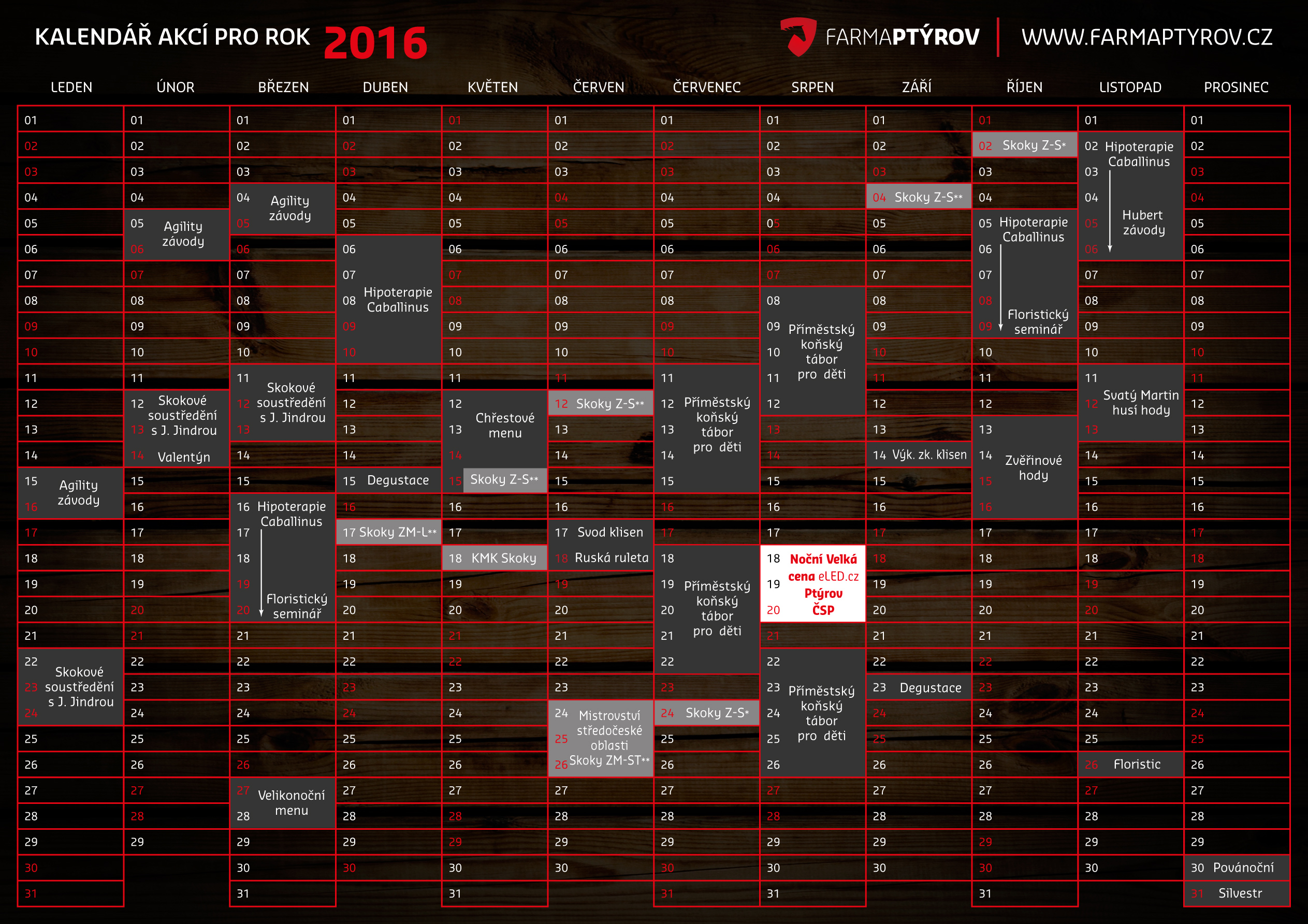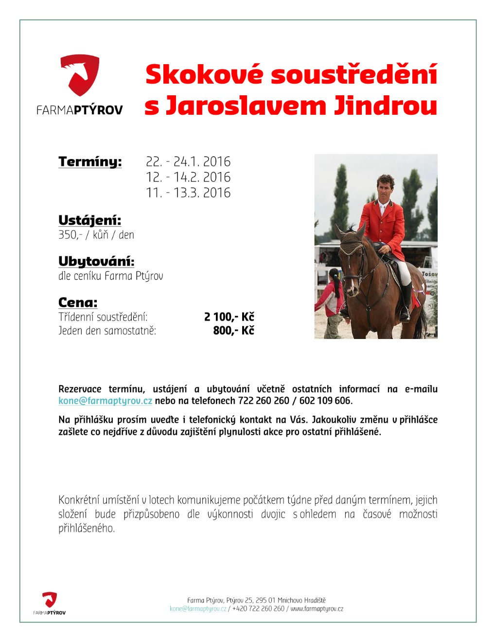 Na Farmě Ptýrov se v roce 2016 uskuteční celkem deset skokových závodů a soustředění s Jaroslavem Jindrou. Tři soustředění se uskuteční každý měsíc od ledna do března. Skokové závody odstartují 17. dubna a sezonu ukončí Skokové závody Hubert ZM-ZL. V sprnu je opět v rámci seriálu závodů Český skokový pohár v plánu Noční Velká cena Ptýrova. Podrobný program závodů najdete uvnitř.