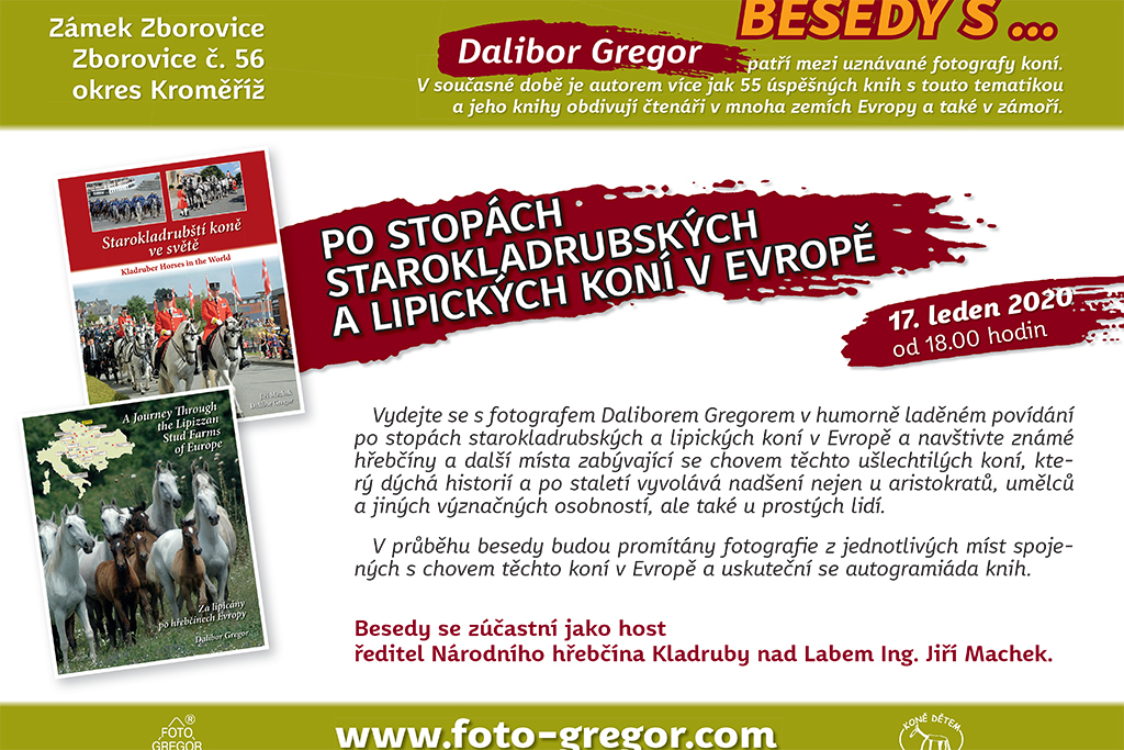 V pátek 17. ledna se od 18 hodin uskuteční na zámku Zborovice beseda s Daliborem Gregorem s názvem „Po stopách starokladrubských a lipických koní v Evropě“. V průběhu besedy budou promítány fotografie z jednotlivých míst spojených s chovem těchto koní v Evropě a uskuteční se autogramiáda knih.