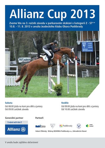 Jezdecký klub Obora Poděbrady zve na 3. ročník jezdeckých závodů v parkurovém skákání Allianz Cup na stupních obtížnosti od Z až do ST** a to o víkendu od 10. do 11. srpna. Celková dotace závodů činí 100 000,- Kč!