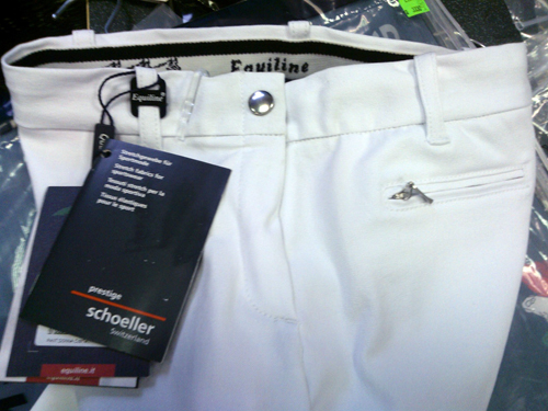 Bílé rajtky značky Equiline s celokoženým sedem. Rajtky jsou dostupné již pouze ve velikosti 40. (Pozor jedná se o italské číslování – velikost 40 odpovídá cca velikosti 36.)