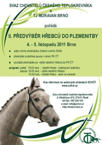 Pátý ročník předvýběru hřebců do plemenitby v rámci PK ČT odstartoval 4. listopadu, od 15 hodin hodnocením exteriéru mladších hřebců. Celá akce se konala v areálu TJ Moravan Brno. Pozvánku najdete uvnitř článku. Aktualizace 6. 11. 21:20 HOD: Vložen odkaz na fotogalerii. Vítězem předvýběru se stal francouzský hřebec Trust Me.