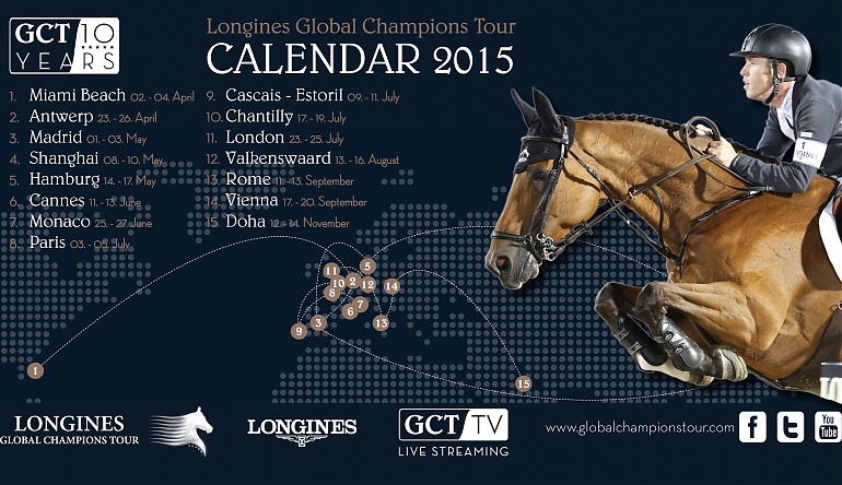 Světová série Global Champions Tour 2015 čítá 15 závodů, o jednu etapu více než v loňském roce, rozmístěných po různých koutech světa. Novými pořádajícími místy jsou Miami Beach, které první víkend v dubnu celý seriál zahájí, a Řím. Minulý rok se Zuzana Zelinková a Ondřej Zvára účastnili GCT ve Vídni. Bude mít i v letošním roce Česká republika zastoupení ve světovém seriálu? Aktualizace 19. 3. 10:30 HOD: První etapa se koná již za 14 dní v termínu 2. – 4. dubna. Aktuální přehled přihlášených jezdců zde.