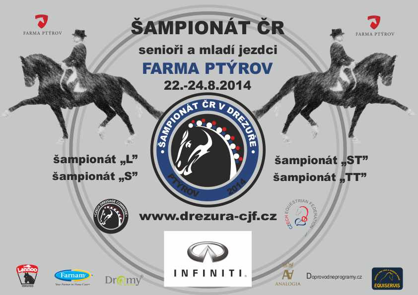 Farma Ptýrov se připravuje na další závody, a to v jiné disciplíně než skoky. V termínu 22. – 24. srpna proběhne Šampionát ČR v drezuře seniorů a mladých jezdců. Aktualizace 24. 8. 11 HOD: L – po dvou kolech zvítězila Petra Miki Civišová s klisnou Bordeaux 3 s celkovým hodnocením 66,071 %. Během její jízdy na hudbu vypadl proud a bylo jí umožněno zajet úlohu znovu. 15 HOD: S – vítěz D. Valentová a Beau van de Zelm (67,062 %); ST senioři – vítěz M. Habásková a Allitair (66,397 %). ST mladí jezdci – vítěz K. Šimáčková a Coconut. 15:30 HOD: TT – vítěz Fabrizio Sigismondi a Trevis Jospo. 17:30 HOD: JU – vítězem mistři v kategorii dětí T. Čechurová a Elfen Prinz. Kompletní výsledky uvnitř. 27. 8. 13:20 HOD: Projekt šampionátu vznikl díky Drezurní komisi ČJF a jeho záměrem je zvýšit popularitu drezury a zájem jezdců o tuto disciplínu. Celá tisková zpráva zde.