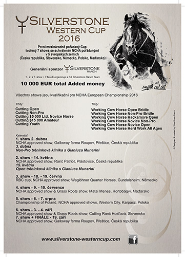 Silverstone Western Cup 2016 je první mezinárodně pořádaný Cup tvořený 7 shows se schválením NCHA pořádanými v 5 evropských zemích (Česká republika, Slovensko, Německo, Polsko, Maďarsko) ve westernových disciplínách cutting a working cow horse. Všechny shows jsou kvalifikační pro NCHA European Championship 2016. Termíny naleznete uvnitř.