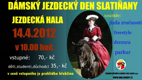 V sobotu 14. 4. se ve Slatiňanech od 10 hodin konal tradiční Dámský jezdecký den, během něhož se jezdkyně utkaly v jízdě zručnosti, soutěži freestyle, drezuře i v parkuru. V ceně vstupného (70,- Kč, děti, studenti a důchodci 35,- Kč) byla navíc také prohlídka hřebčína.